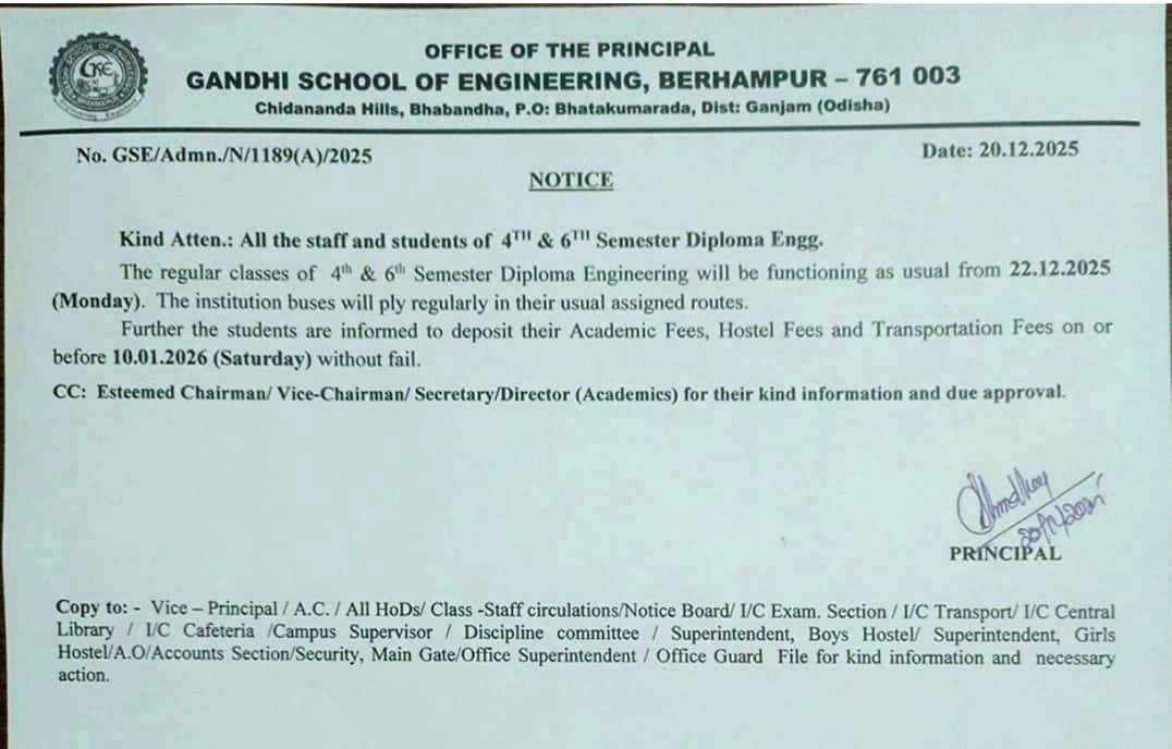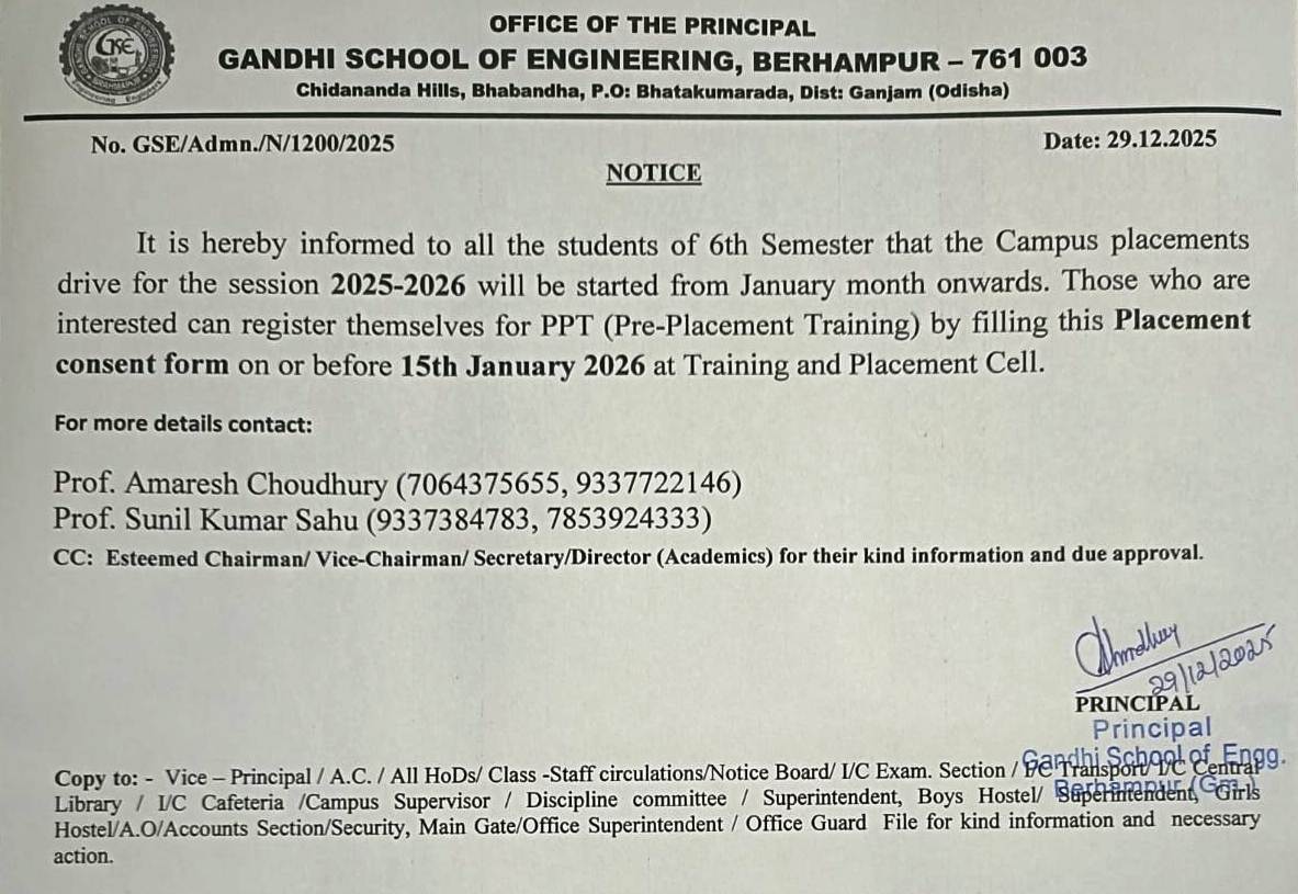 Gandhi School of Engineering(Polytechnic) is one of the Premier Technical Institute in Diploma Engineering Since 2008 Under Saraswata Educational & Charitable Trust. It aims at building the budding generation with a noble mission of engineering a healthy and technologically developed society. ISE, the man-making industry,insists on forming the character. Here we trust in creating engineers and character. Since the progress of a nation banks on this indispensible aspect. The wheels of the chariot of out institute runs smoothly with a gallaxy of versatile faculty members.All the teaching and non-teaching staff are always committed to accomplish whatever they are assigned unhesitatingly with a smile. Standing adjacent to Bhabandha ,Berhempur,Our Institution shines in a pollution free ambience welcome one and all.